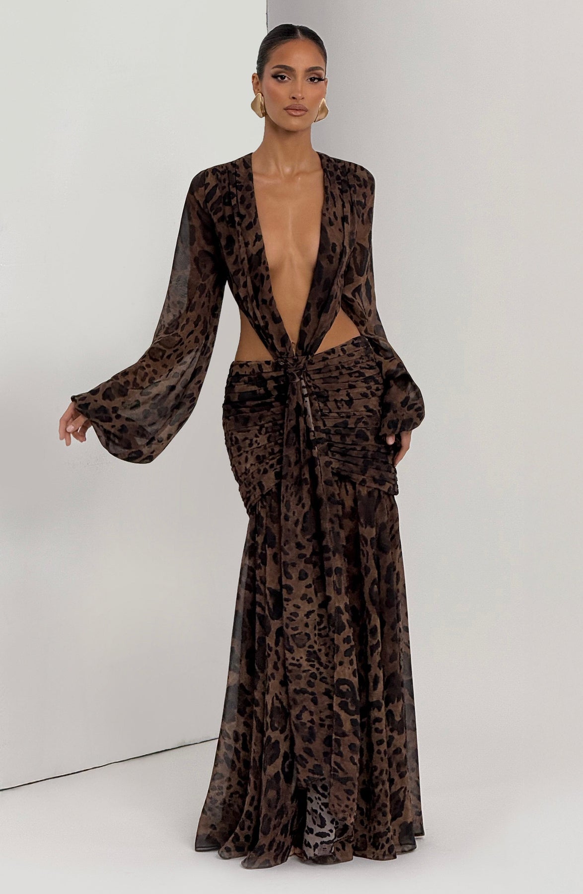 Los vestidos maxi Andrina con estampado de tigre incluyen una tela de gasa fluida con un escote profundo y mangas largas y transparentes. La espalda abierta con el cordón y los lazos en la parte delantera añaden detalles elegantes, mientras que el panel reducido en la zona del muslo y la falda semi plegable crean una silueta hermosa que es adecuada para eventos refinados.
