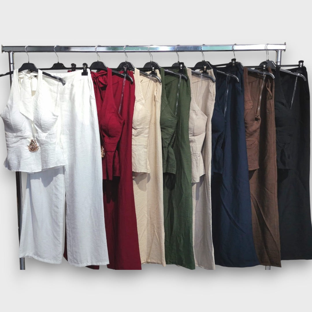 Lorine es un conjunto que combina artísticamente la suavidad femenina con líneas modernas. La parte superior ajustada con atado en el cuello y volantes suaves acentúa el centro del cuerpo, mientras que los pantalones anchos aportan longitud y ligereza con cada movimiento. Un look que no busca llamar la atención – y por eso permanece en la memoria. Para las noches, encuentros o momentos que haces significativos.