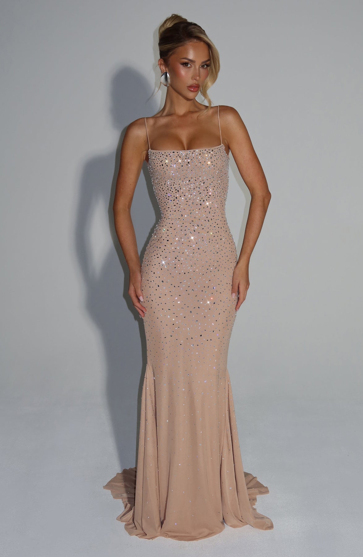 Los vestidos Lorali en nude incluyen una red elástica con strass en un degradado de colores, cuello cuadrado, tirantes delgados y espalda abierta con lazo. La parte central reciclada y la falda acampanada con una pequeña cola ofrecen una elegancia sofisticada.