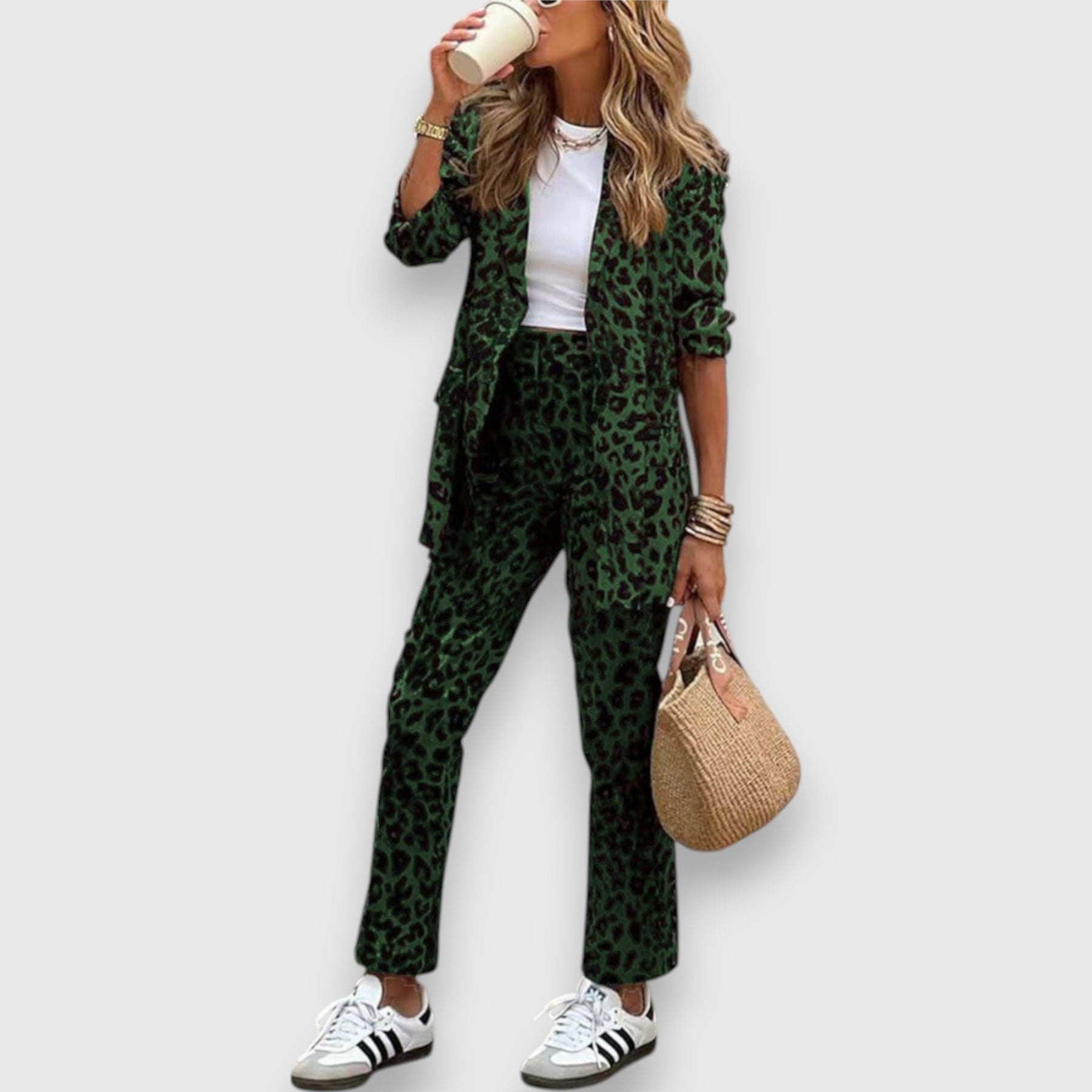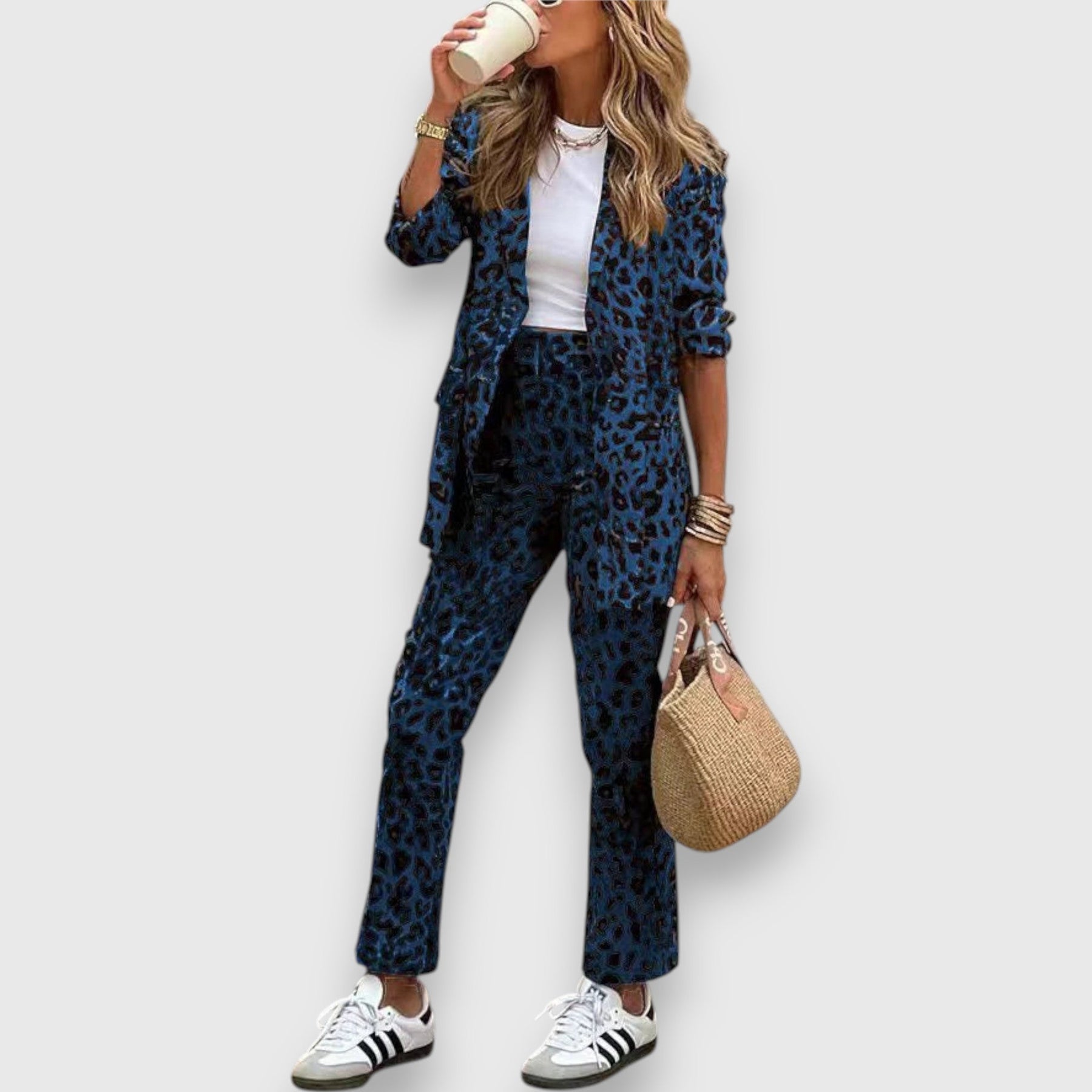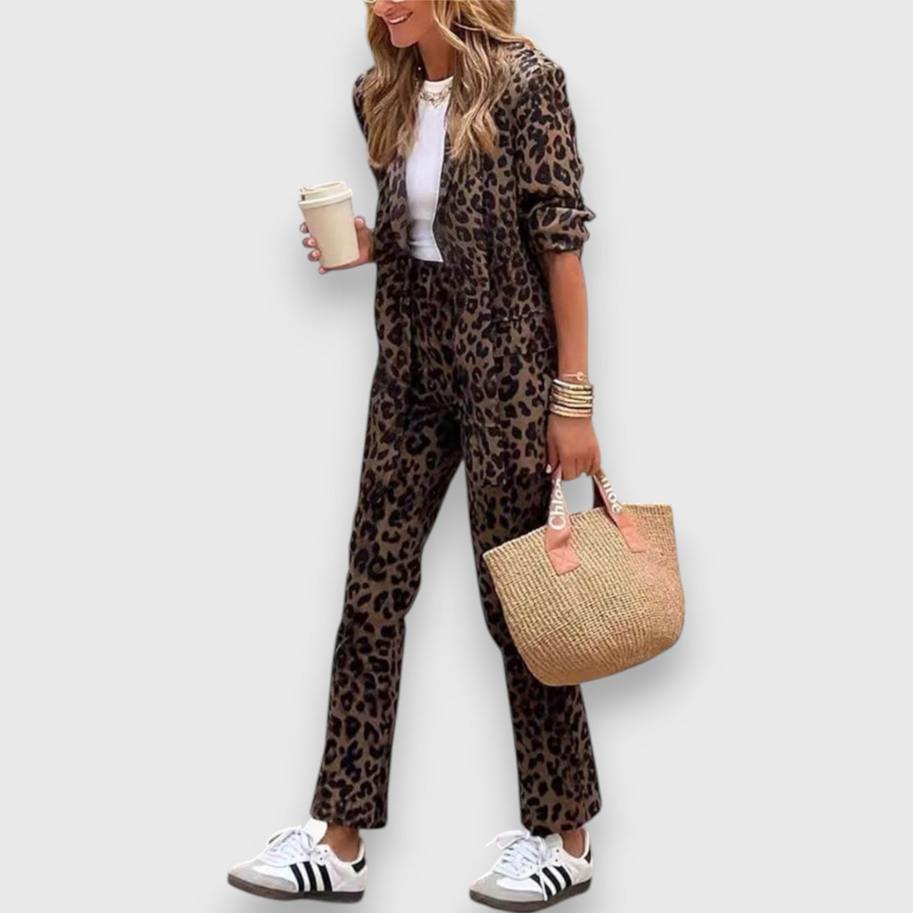 Zaira no es un capricho – es una expresión. Un traje que irradia confianza sin ser ruidoso. La chaqueta relajada y los pantalones de tiro alto con estampado de pantera moderno combinan comodidad con clase urbana. Ya sea con zapatillas para un café para llevar o con tacones para la noche – Zaira se adapta a tu energía.
